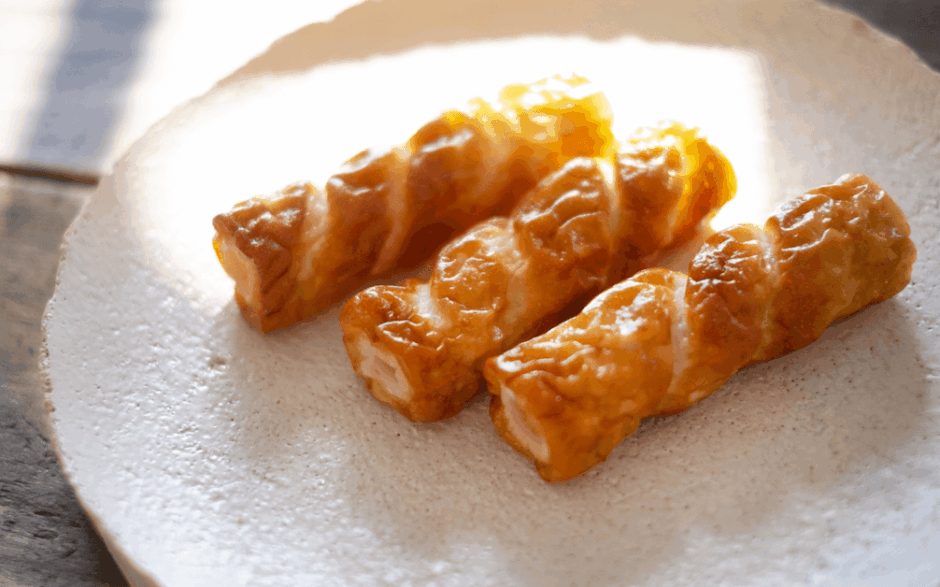 ちくわを7ミリ幅で斜め切りにし、薄力粉・青のり・水などで作った衣を絡めて、油を熱したフライパンで両面こんがり焼いたら出来上がり。